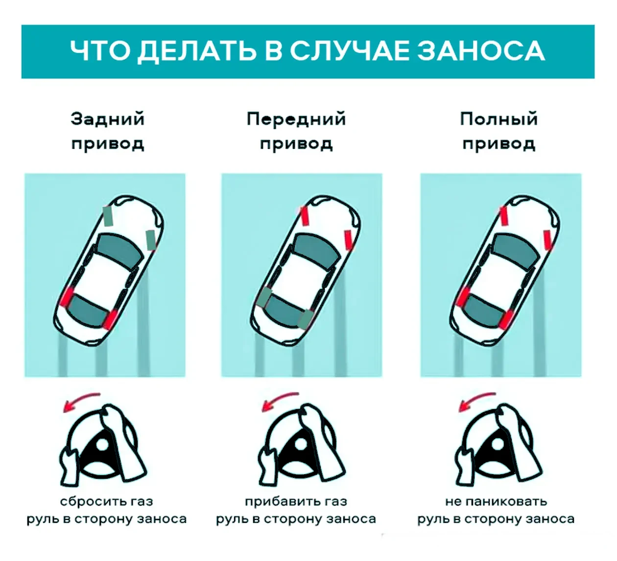 • При заносе переднеприводного — добавить газа, заднеприводного — убрать газ и руль в сторону заноса
